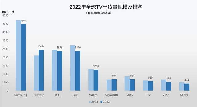 作为国货名片的海信表现尤为抢眼。据权威机构Omdia数据统计,在2022年的全球电视市场出货量中,海信稳居世界第二,仅次于三星,另外两个国产品牌TCL和小米分别位居第三和第四名,海信率领中国品牌成功跻身全球TV产业的第一梯队,值得一提的是,这也是电视出现64年来,中国品牌首次实现对欧美品牌的碾压。